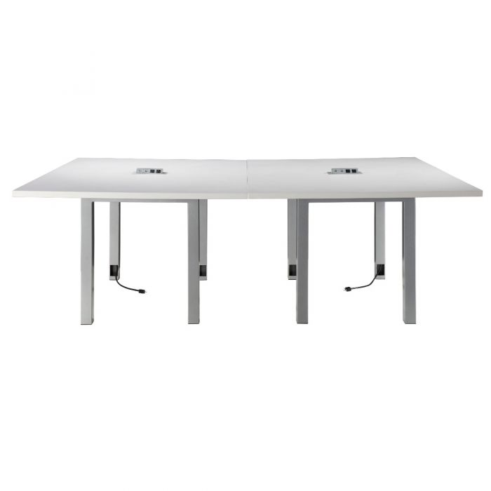 8' rectangle white laminate conference table with silver powder coated legs. The 8' Table is comprised of two 5' x 4' tables and features two centered powered flip tops and wire management within each leg.