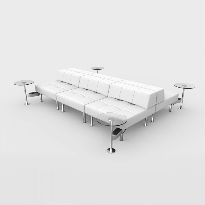 Modular double low back vinyl sofa with chrome legs and 4 round glass-top powered tables. Each powered table includes one black rectangular power hub.