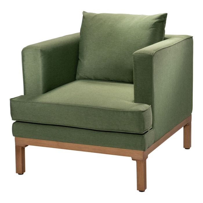 Casual fern green accent chair with a teak-toned "wood look" metal frame. Suitable for both indoor and outdoor events.